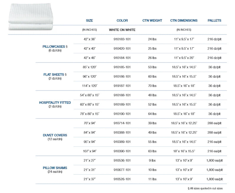 •  42 x 36”, 42 x 40”, 42 x 46” Pillowcases - 3” Hems